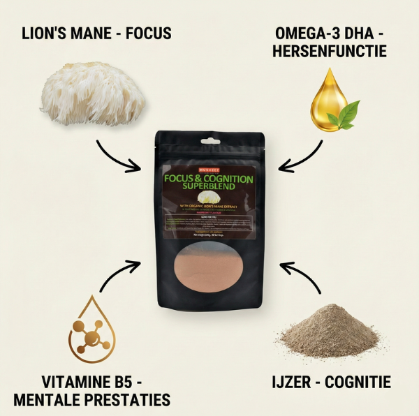KRACHT: OMEGA-3 DHA + JODIUMUpgrade je brein. Een geavanceerde nootropic blend met Lion's Mane, Omega-3 en MCT voor laser-focus.